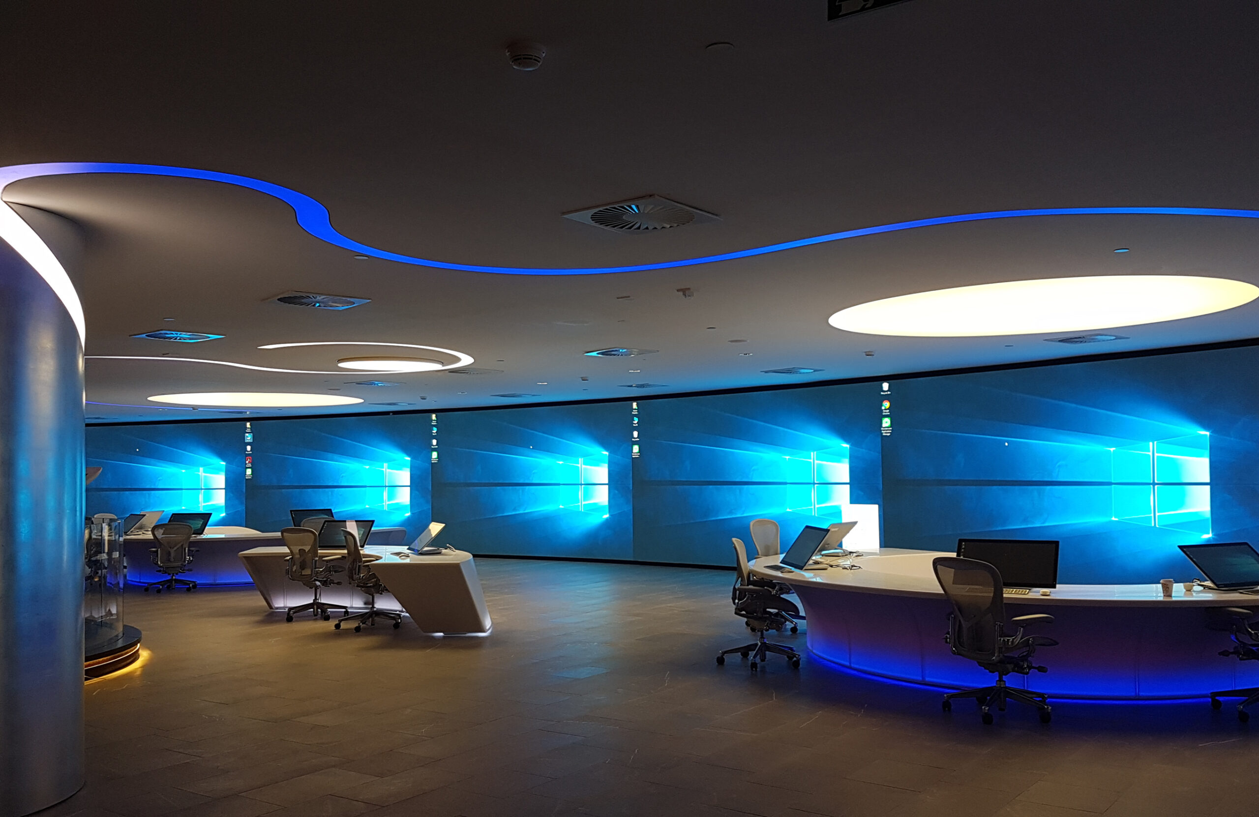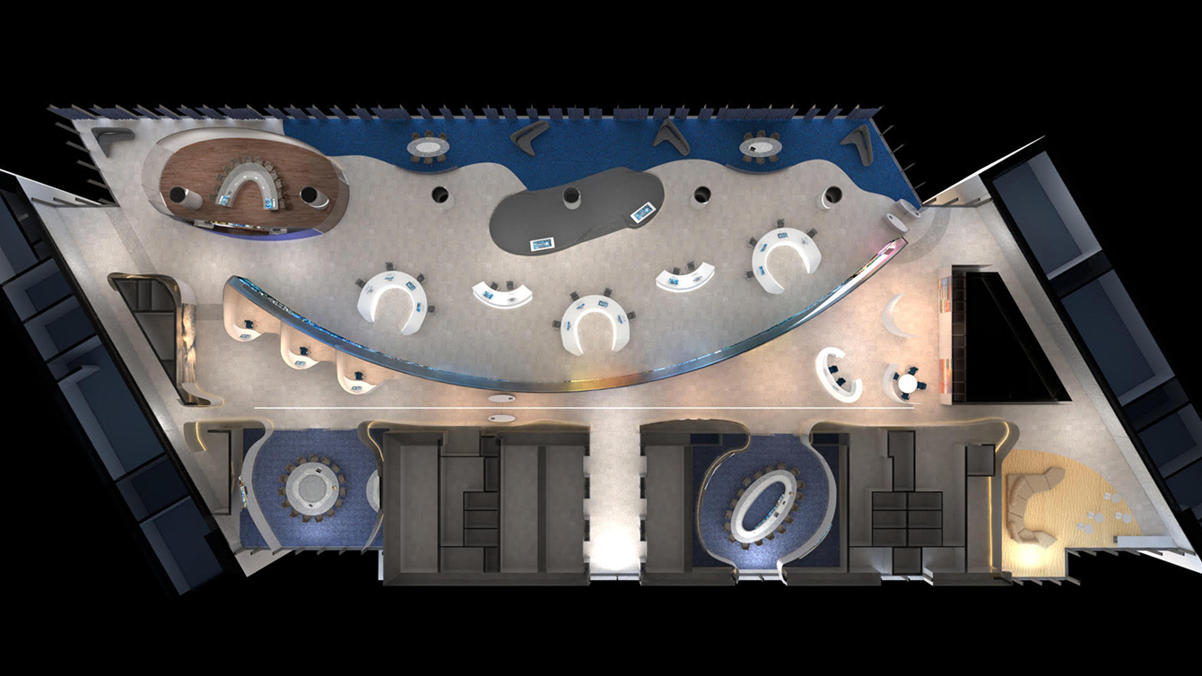 The “Bridge”, located in the main area, embodies a combination of a Control Platform and a Visitor Presentation Area. Due to its raised position, the Bridge provides great visibility over the entire Video Wall.