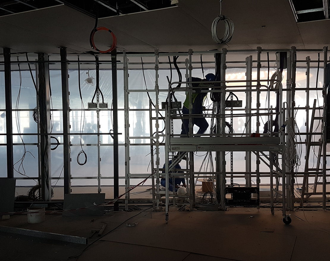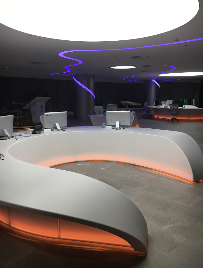 A 50-metre floor-to-ceiling LED Video Wall cuts across the Commad Center, enabling the real-time monitoring and analysis across ADNOC group’s full value chain. Its position within the space was chosen with the aim of enhance the magnificent view over Abu Dhabi.